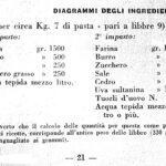 Nel preparare l’ultimo impasto del lievito figlio, qualunque sia la forza della farina impiegata, per passare poi alla confezione dei panettoni, non si deve mai aggiungere farina in più o in meno del quantitativo corrispondente al lievito impiegato, per ottenere un lievito in forza. L’aria ha anch’essa influenza sulla buona riuscita — 20 — del panettone e perciò si consiglia, dove l’aria è fina, di ridurre eventualmente la proporzione del lievito di un 10-15% del peso ai sensi delle rispettive ricette, mentre là dove l’aria è pesante tale proporzione può essere aumentata di un 10-15%.