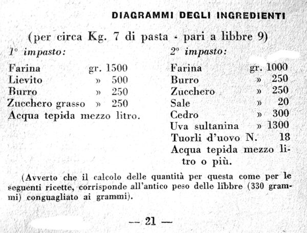 ‘L’insuccesso di molti che si accingono alla fabbricazione del panettone di Milano è dovuto alla, poca importanza che si suoi dare alla preparazione del lievito che senza un po’ di pratica molto difficilmente riesce. Innanzi tutto occorre avere un certo tirocinio per conoscere a fondo la pasta levata che è la più difficile a confezionare. Per la preparazione del lievito, operazione base per la buona riuscita delle paste levate in genere e del panettone milanese in specie, occorre saper conoscere la gradazione di forza delle farine impiegate e dei singoli lieviti per far sì che la fermentazione non abbia a rendere il lievito in un primo tempo troppo forte.
