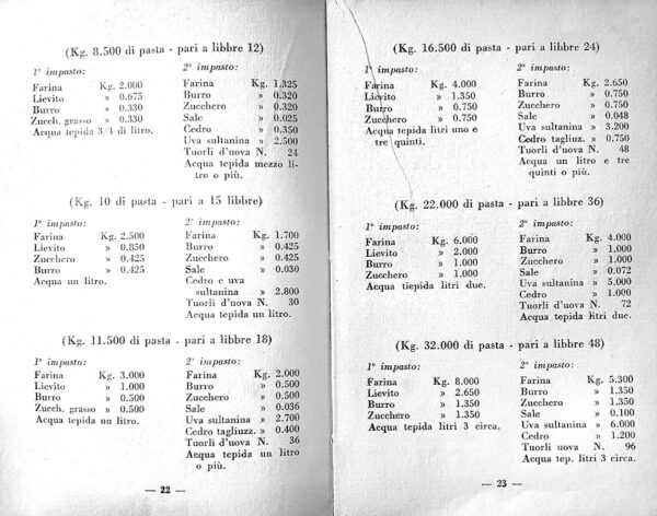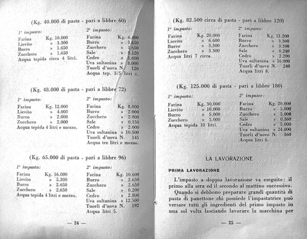 L’impasto a doppia lavorazione va eseguito: il primo alla sera ed il secondo al mattino successivo. Quando si debbono preparare grandi quantità di pasta cli panettone chi possiede l’impastatrice può versare tutti gli ingredienti del primo impasto in una sol volta lasciando lavorare la macchina per – 25 – dieci minuti circa fino ad ottenere una pasta sostenuta che poi si deporrà in un mastello di dimensione adeguata, avvolgendo la pasta in una tela spolverata di farina. Si porti il mastello con la pasta in un ambiente che abbia almeno 25 gradi a lievitare. Il tempo necessario alla lievitazione è di almeno 10 ore; in caso d’urgenza si può ridurre a 6 ore collocando però la pasta in un ambiente più caldo. Necessitando di prolungare il periodo di lievitazione si farà in modo che il calore dell’ambiente sia inferiore. Chi manca dell’impastatrice deve attenersi al seguente sistema di lavorazione. Stendere sulla tavola a corona la farina; nel centro di essa si pone il lievito sul quale si verseranno il burro liquefatto e lo zucchero sciolto preventivamente in acqua tepida. Ciò fatto s’impastano bene il lievito col burro e lo zucchero e grado grado vi si incorpora la farina. Il tutto va lavorato per 15 minuti con le mani strette a pugno.